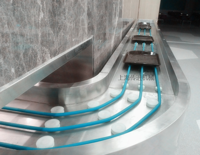 繩帶式餐具輸送機是通過平行的膠帶通(tōng)過鏈輪驅動平底托盤在不(bú)鏽鋼台麵滑動,傳送過程無噪音,輸送(sòng)圓帶不易蛇行、跑偏,並(bìng)且由於膠帶厚實可以經得起(qǐ)轉彎、碰撞,及耐油(yóu)、耐水等特性,使得在使用時不致在維修保養上產生困擾,尤其在更(gèng)換(huàn)輸送帶上網帶(dài)輸送線(xiàn)更減少一筆開銷。本公司可依據客(kè)戶要求量身定製。